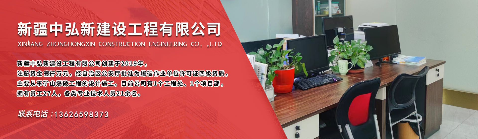 ZHONGHONGXIN CONSTRUCTION ENGINEERING 公 司 簡 介新疆中弘新建設(shè)工程有限公司創(chuàng)建于2019年,注冊資金壹仟萬元,經(jīng)自治區(qū)公安廳批準為爆破作業(yè)單位許可證四級資質(zhì),主要從事礦山爆破工程的設(shè)計施工、礦上采掘施工業(yè)務(wù)。目前公司有1個工程處、2個項目部,分...